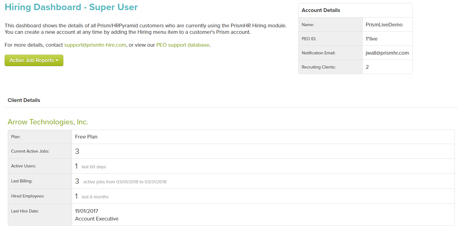 As a PEO, you need to have information about your clients' hiring activity in a centrally located area so you are better equipped to support your clients. We have created a PEO Hiring Dashboard for that very purpose. It provides your super user team with hiring KPIs and active job reporting across all of your clients. Here is what you'll see and below you will find instructions on how to enable access to this handy reporting tool in HRP WE.